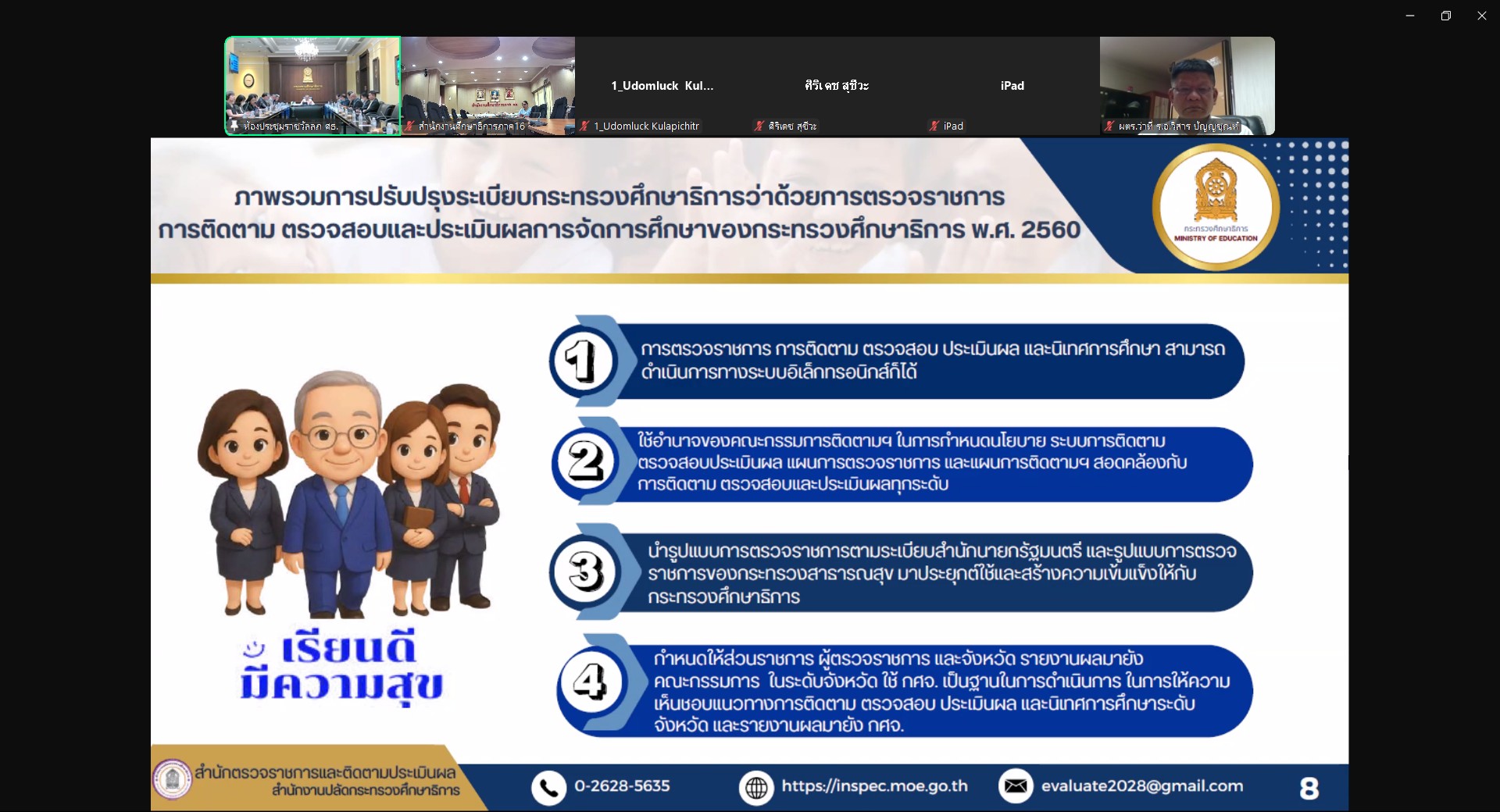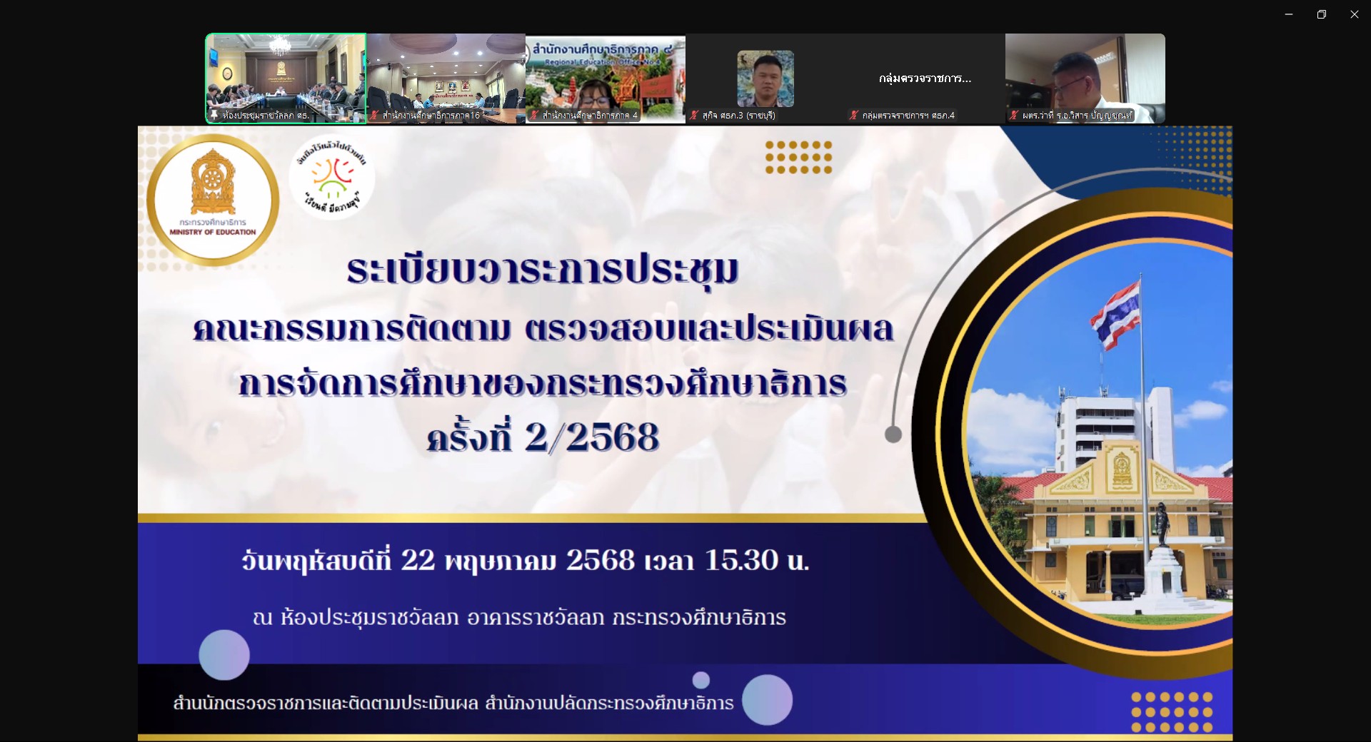 วันพฤหัสบดีที่ 22 พฤษภาคม 2568 นายชาตรี ม่วงสว่าง ผู้ตรวจราชการกระทรวงศึกษาธิการ ปฏิบัติหน้าที่ศึกษาธิการภาค 16 มอบหมายให้นางวิลาวัณย์ สิทธิประเสริฐ ตำแหน่ง นักวิชาการศึกษาชำนาญการ และนายกฤษนา สีไพร ตำแหน่ง นักจัดการงานทั่วไปชำนาญการ พร้อมด้วยบุคลากรสำนักงานศึกษาธิการภาค 16 เข้าร่วมประชุมคณะกรรมการติดตาม ตรวจสอบ และประเมินผลการจัดการศึกษาของกระทรวงศึกษาธิการ ครั้งที่ 2/2568 ผ่านสื่ออิเล็กทรอนิกส์ Zoom Conference โดยมีพลตำรวจเอก เพิ่มพูน ชิดชอบ รัฐมนตรีว่าการกระทรวงศึกษาธิการ เป็นประธานการประชุมดังกล่าว